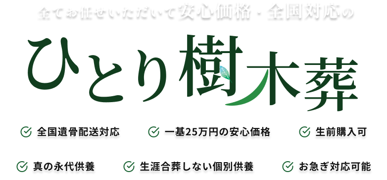 A. ひとり樹木葬の費用には永代使用料、埋葬料、墓石代、プレート代、永代供養料、管理費、納骨代、戒名代のすべてが含まれています。一度お支払いいただくとその後は費用が一切かかりませんので、生前にご契約いただくとその後は安心して過ごすことができます。